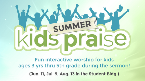 Mark you calendar for Summer Kids' Praise in the Student Building. We welcome kids ages 3 years through 5th graders to join in on this interactive and fun worship in the Student Building. For safety, we ask that grown-ups walk your child all the way to the building. They will be dismissed from the Fellowship Hall and exit through Door F. Pick your child from the Student Building promptly at the conclusion of worship.