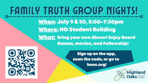 Come and join us for "Family Truth Group Nights" this summer! These nights will be a time of fun with board games, movies, and fellowship. Bring your own dinner and favorite game and meet us up at the Student Building for some fun, family-oriented evenings. HO Kids, Students, parents, and volunteers are encouraged to come.