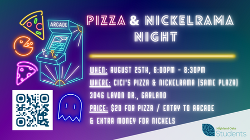 Cost is $20 (~$15 for pizza/a drink and $4.95 for entry into Nickelrama) plus cash/extra money for nickels to play games. Parents of HO Students may drop their kids off at 6:00pm and pick them up at 8:30pm. Parents with younger children (siblings/those in HO Kids) are welcome to attend but will need to stay with their children for the evening.
