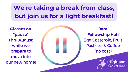 Just a reminder that there are no Sunday morning classes through August and possibly part of September. We're taking a break while we prepare for our upcoming move into our new home at 9400 Plano Rd., Dallas, TX 75238.