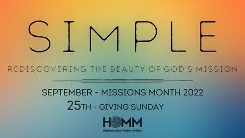 Join us this month as we focus on our mission efforts here at Highland Oaks. The theme for this year is "Simple: Rediscovering the Beauty of God's Mission." Throughout September, we'll think about the simple songs and prayer of mission, as well as saying "yes" to the simple invitation to come alongside God in what He is doing in the world. Our goal for this year* is $160,000 and we need your support to meet the budget for this year. You can make your pledge online or in person. For more information on our mission efforts visit the "Missions" tab on our website and/or talk to Josh Tracy, our Sending and Missions Minister.